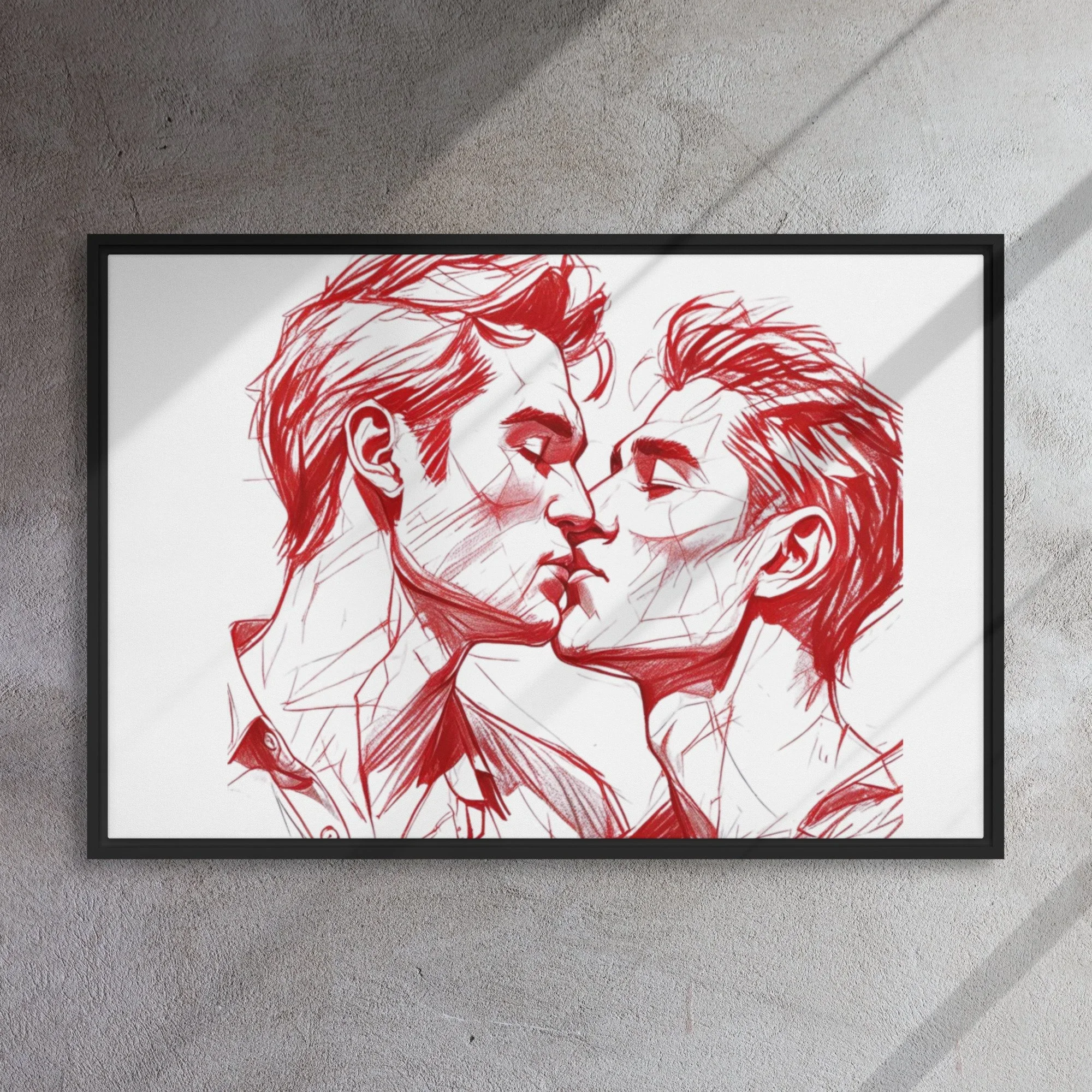 A single-line illustration of two men in a quiet kiss, drawn in rich red for warmth and impact. This modern statement brings tenderness and strength anywhere—from living rooms to gallery walls. It’s perfect for anniversaries, weddings, Pride gifts, or celebrating love every day.